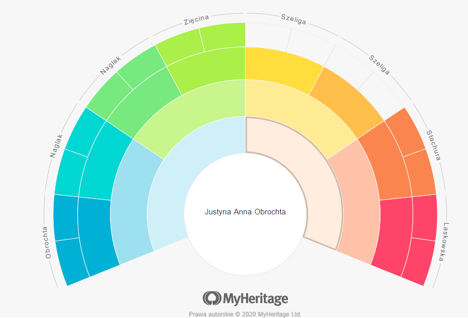 Tryb kolorystyczny pokazuje główne nazwiska rodowe na zewnętrznym obwodzie (po najechaniu kursorem na kartę danej osoby), wzięte od Twoich pradziadków.