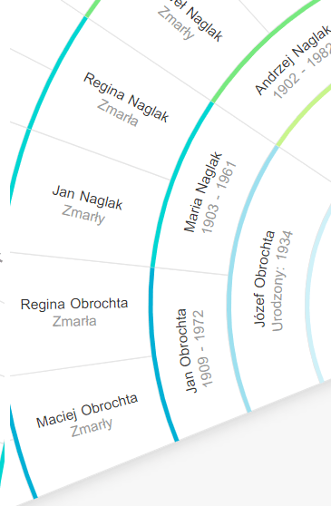 Po kliknięciu pojawi się Widok promienisty drzewa, ukazując osobę “z korzenia” i jego przodków.
