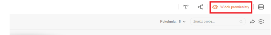 W celu ustawienia ilości pokoleń w Widoku promienistym, skorzystaj z otwieranego menu pokoleń, które znajduje się po lewej stronie pola wyszukiwania.