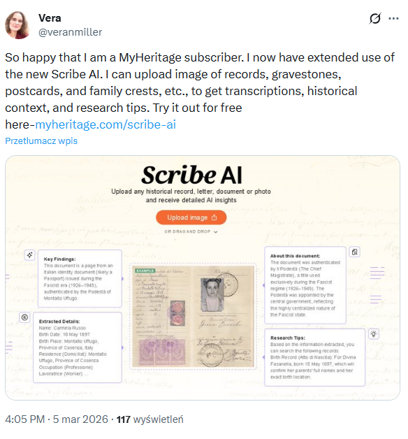 Bardzo się cieszę, że jestem subskrybentem MyHeritage. Mam teraz rozszerzony dostęp do nowej funkcji Scribe AI. Mogę przesyłać zdjęcia zapisów, nagrobków, pocztówek, herbów rodzinnych itp., aby uzyskać transkrypcje, kontekst historyczny i wskazówki badawcze. Można wypróbować bezpłatnie tutaj – https://t.co/9mTIQIJ4ey pic.twitter.com/mlXuCku6FY